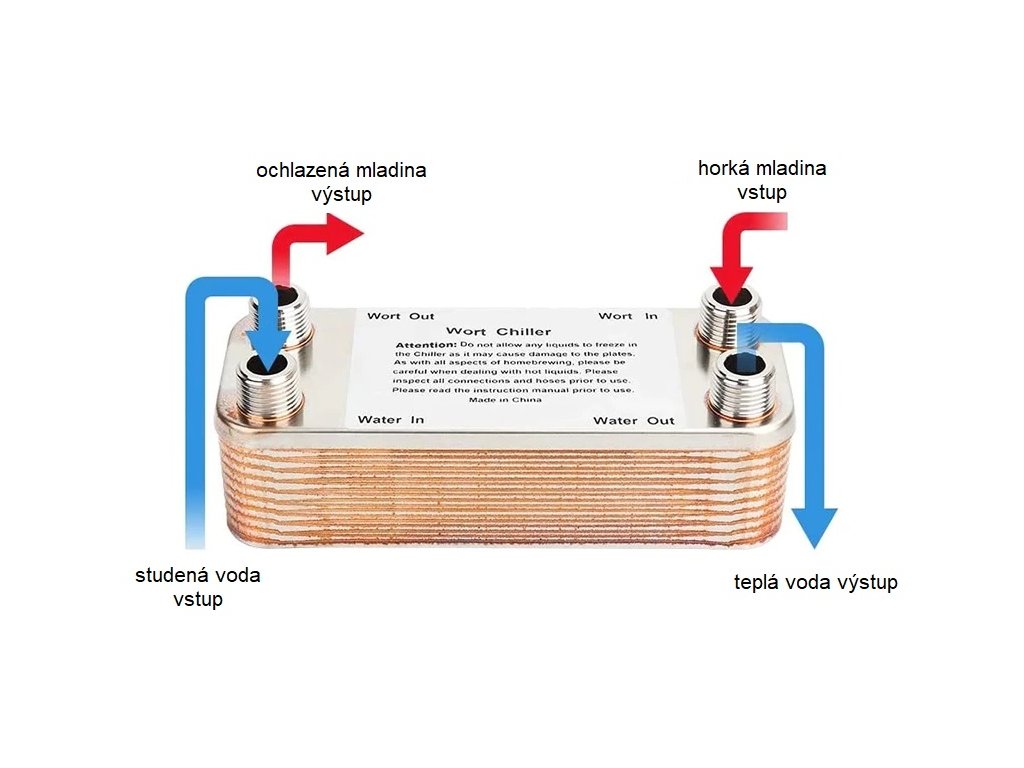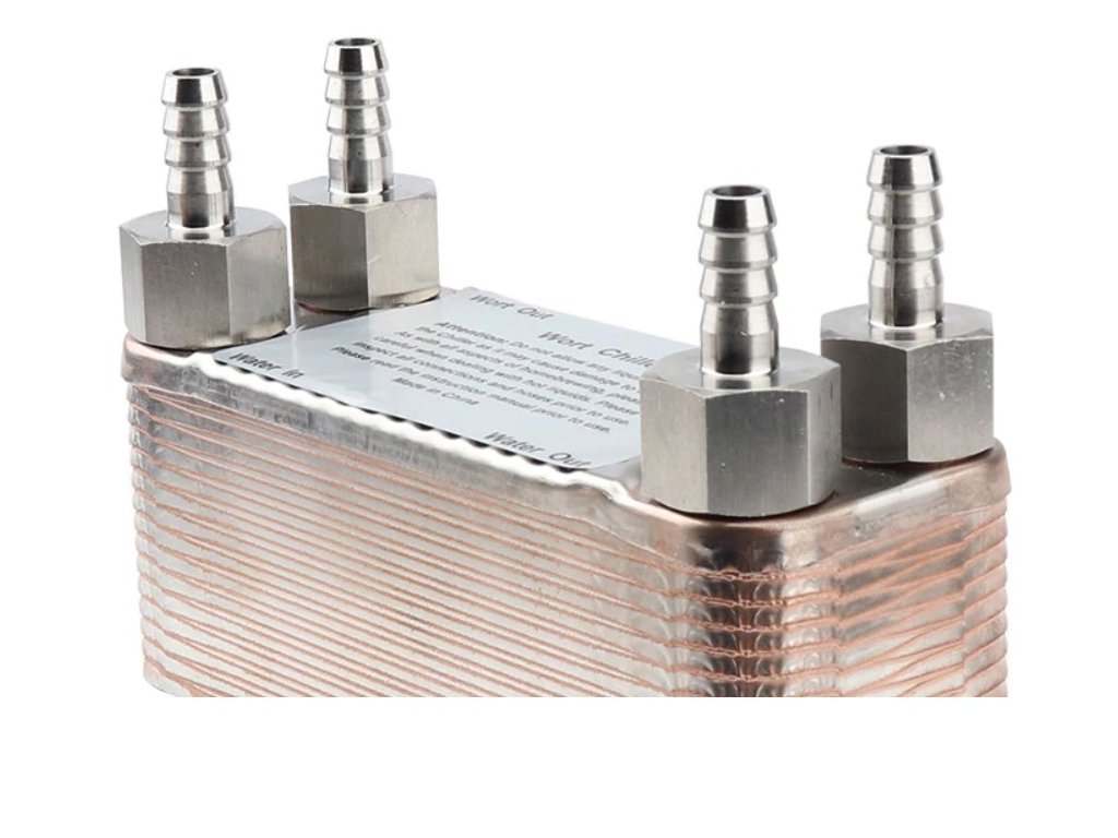 Nerezový deskový chladič mladiny 30 desek MINI. Rychlost chlazení mladiny závisí na teplotě vody z vodovodu a rychlosti průtoku.
