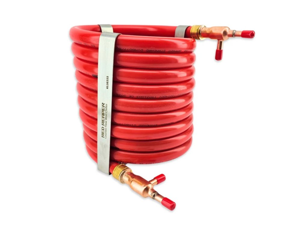 - Efficient Red Reaper counterflow chiller with quick-connect fittings and garden-hose connection.