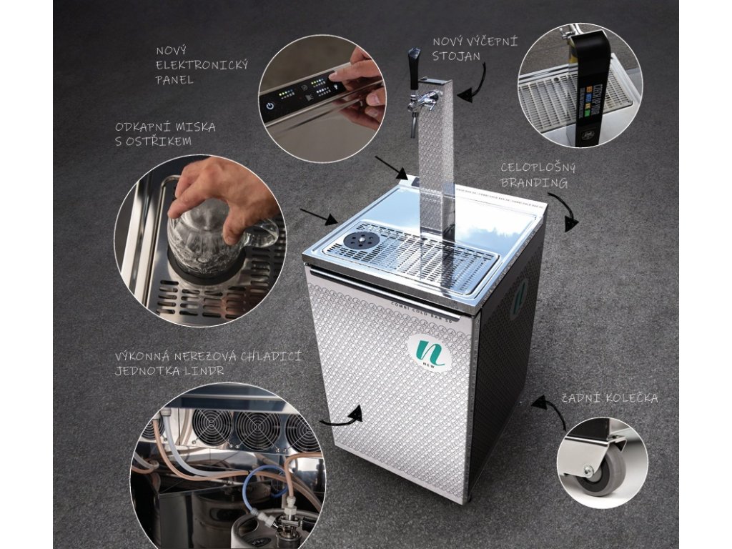 - The unit is equipped with a unique contact-cooling system for the draft tower, eliminating the need for water recirculation. A specially designed cooling circuit keeps the entire beer line at a stable temperature up to the tap, preventing beer from warming in the tower and ensuring perfect serving temperature even after longer pauses in pouring.