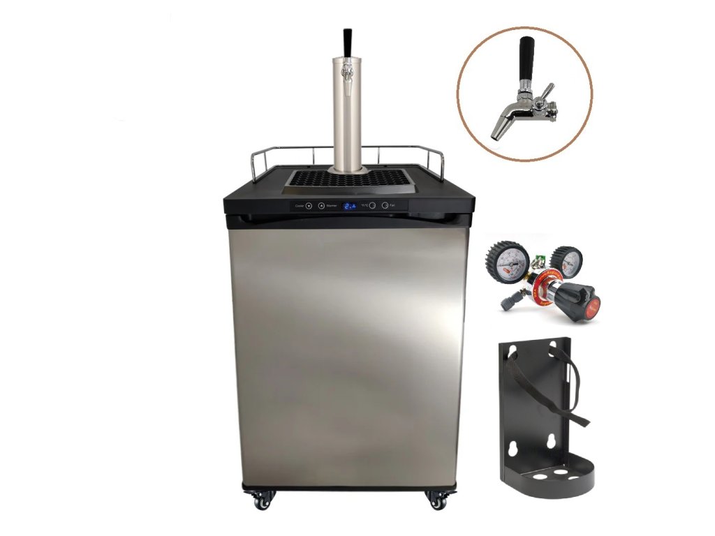 Kegerátor KEGBOX.4 Vám zajistí dokonalé osvěžení na oslavách, grilovačkách či posezeních s rodinou a přáteli. Výčepní zařízení je primárně určeno pro čepování piva, ale stejně tak ho můžete využít i pro nealkoholické limonády. Do prostorné lednice "vměstnáte" až 4 kyvety, anebo standardní sud do velikosti 50 litrů. Díky digitálnímu termostatu je ideální nejen pro chlazení a následné čepování piva, ale i pro jeho kvašení a zrání. Teplotu uvnitř lednice lze jednoduše regulovat na panelu nad dvířky bez nutnosti jejího otevírání. Další předností kegerátoru je osazení výčepním stojanem s výčepním kohoutem s kompenzátorem, díky kterému si můžete regulovat pěnivost čepovaného nápoje. Kegerátor se dodává přímo se všemi potřebnými připojovacími hadicemi a rychlospojkami pro snadnou instalaci.