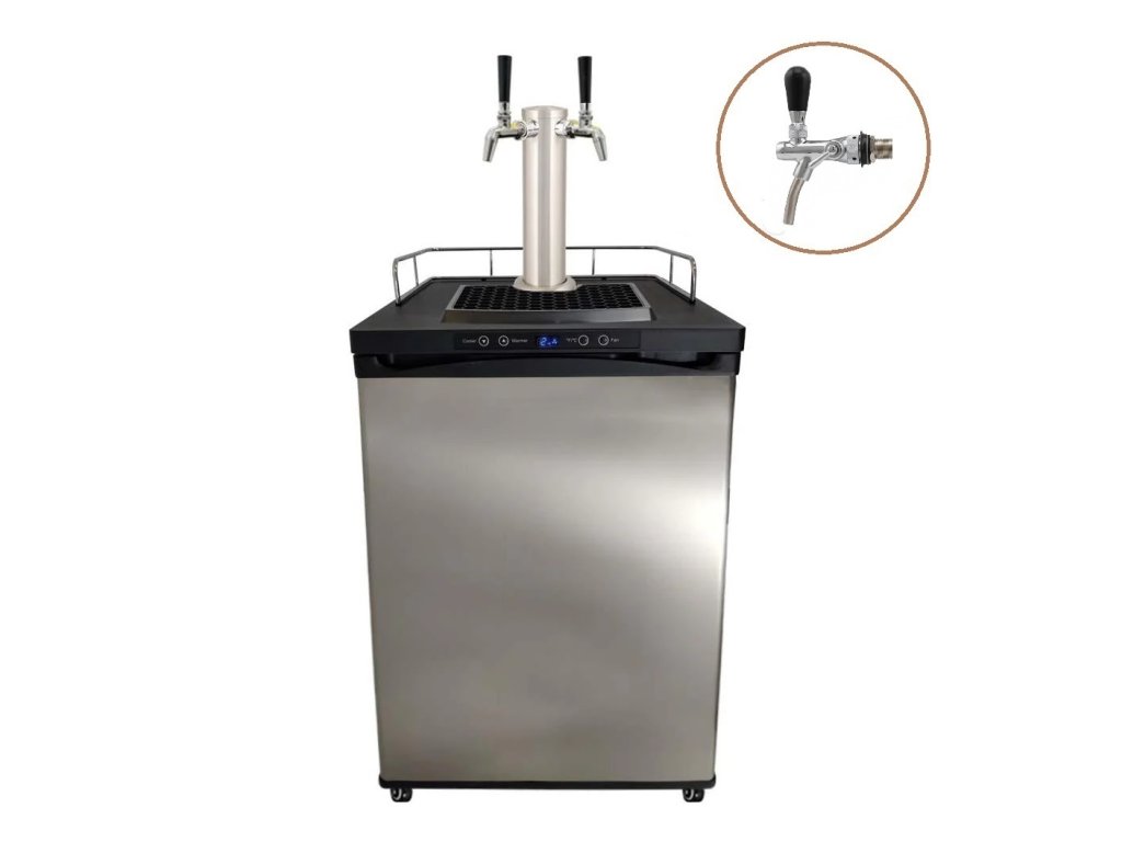 Kegerátor KEGBOX.4 Vám zajistí dokonalé osvěžení na oslavách, grilovačkách či posezeních s rodinou a přáteli. Výčepní zařízení je primárně určeno pro čepování piva, ale stejně tak ho můžete využít i pro nealkoholické limonády. Do prostorné lednice "vměstnáte" až 4 kyvety, anebo standardní sud do velikosti 50 litrů. Díky digitálnímu termostatu je ideální nejen pro chlazení a následné čepování piva, ale i pro jeho kvašení a zrání. Teplotu uvnitř lednice lze jednoduše regulovat na panelu nad dvířky bez nutnosti jejího otevírání. Výhodou těchto lednic je, že pivo není schlazeno šokem a lze čepovat i nefiltrovaná piva díky tomu, že je sud skladován v přesně nastavené teplotě pro daný pivní styl. Další předností kegerátoru je osazení výčepním stojanem s výčepními kohouty s kompenzátorem, díky kterým si můžete regulovat pěnivost čepovaného nápoje. Kegerátor se dodává přímo se všemi potřebnými připojovacími hadicemi a rychlospojkami pro snadnou instalaci.