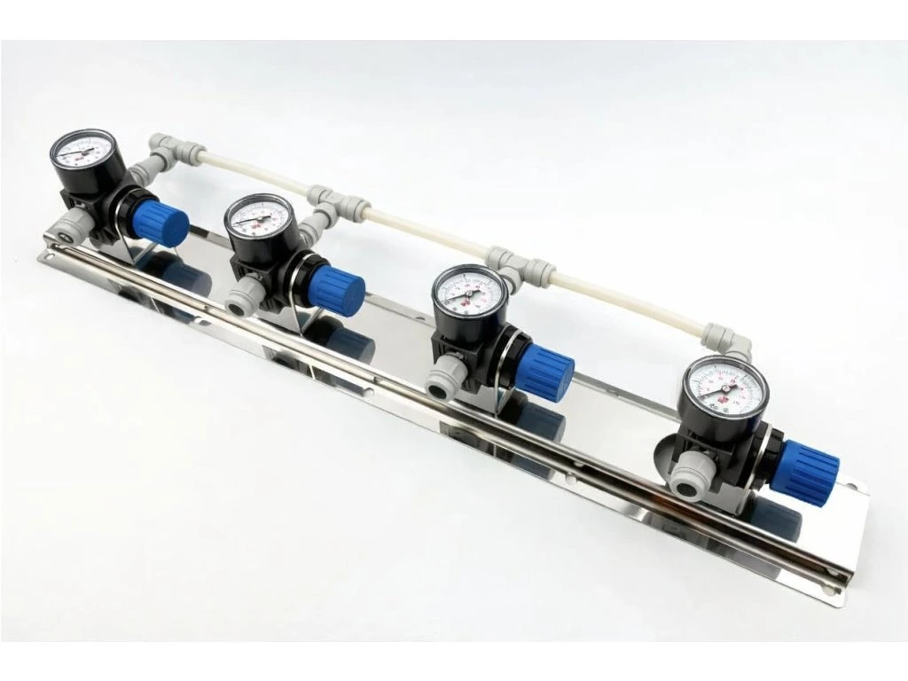 - druhý výstup, na kterém požadujete nižší tlak, propojíte s regulátorem a regulátor s druhým a třetím sudem. Na prvním regulátoru panelu pak nastavíte požadovaný tlak 1,5bar, na druhém tlak 1,3bar, na třetím 1bar a na čtvrtém 0,8bar.
